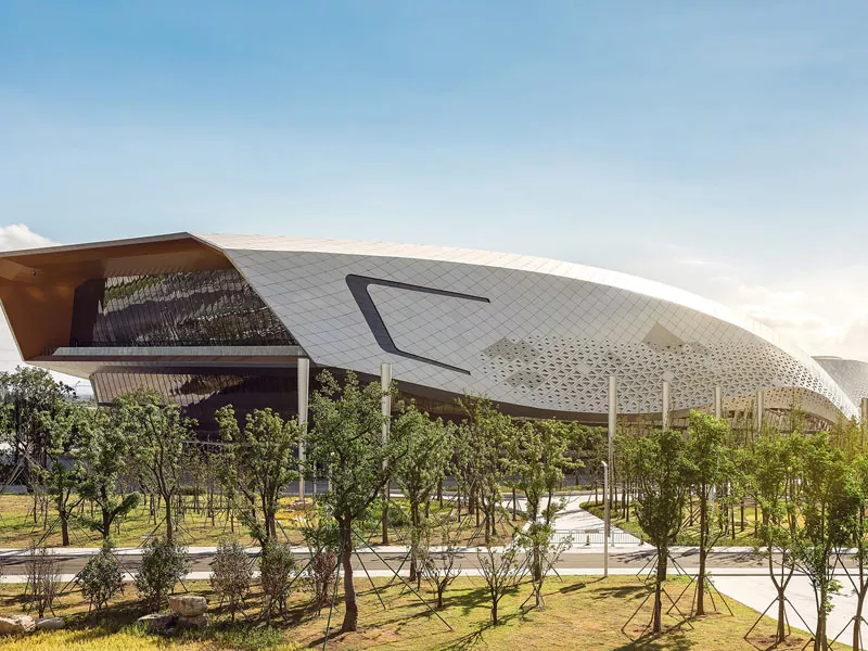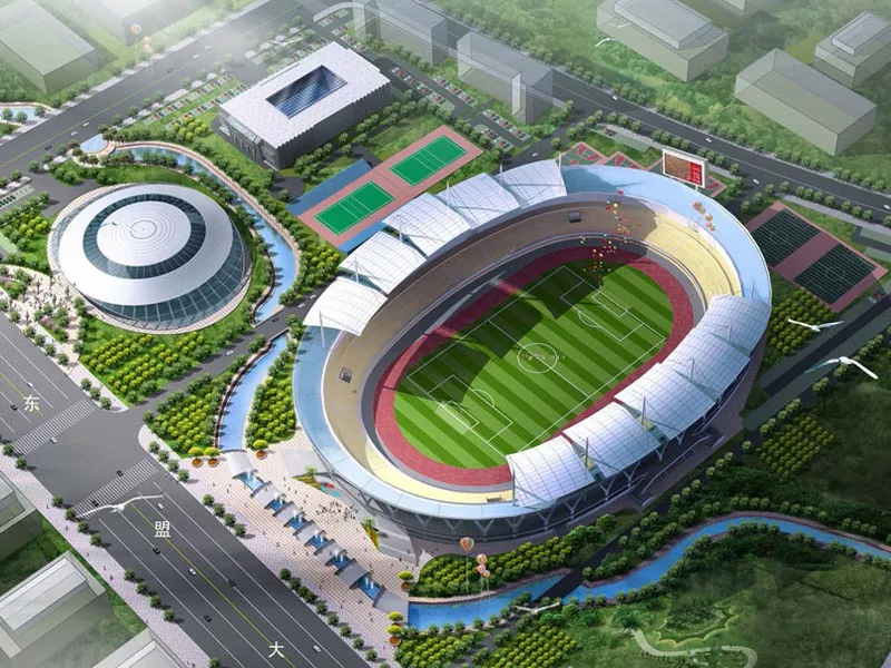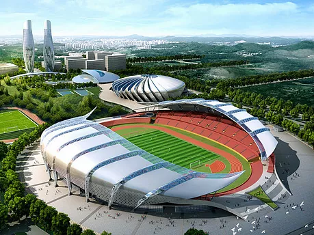 তীখাৰ গঠন কেন্দ্ৰৰ কমপ্লেক্সসমূহ বৃহৎ-স্পেন স্থানীয় ট্ৰাছ আৰু ৰেটিকুলেটেড শ্বেল সৃষ্টি কৰিবলৈ উচ্চ শক্তিৰ তীখাৰে নিৰ্মাণ কৰা হয়, যিয়ে স্তম্ভমুক্ত ছুপাৰ-বৃহৎ স্থানসমূহ লাভ কৰে যিয়ে ক্ৰীড়া অনুষ্ঠান, পৰিৱেশন, আৰু বহু-কাৰ্য্যকৰী কাৰ্য্যকলাপৰ দাবীৰ সৈতে নমনীয়ভাৱে খাপ খাই পৰে। কাৰখানাৰ প্ৰিফেব্ৰিকেটেড উপাদান আৰু মডিউলাৰ সমাবেশ কৌশল ব্যৱহাৰ কৰা হয়, যাৰ ফলত নিৰ্মাণৰ সময় ৪০% হ্ৰাস পায়, যাৰ ফলত স্থানীয় প্ৰদূষণ আৰু শব্দ কম হয়। ইয়াৰ উপৰিও ইহঁতে বুদ্ধিমান উষ্ণতা নিয়ন্ত্ৰণ, ফটোভল্টিক চাল, আৰু বৰষুণৰ পানী পুনঃব্যৱহাৰ ব্যৱস্থাক একত্ৰিত কৰে, যাৰ ফলত শক্তিৰ ব্যৱহাৰ ৩০% তকৈ অধিক হ্ৰাস পায়। তীখাৰ অসাধাৰণ ভূমিকম্পীয় আৰু বতাহ প্ৰতিৰোধ ক্ষমতাই সুৰক্ষা নিশ্চিত কৰে, আনহাতে সুশৃংখলিত তীখাৰ মুখাৱয়ব আৰু স্বচ্ছ পৰ্দাৰ দেৱালে আধুনিক ল্যাণ্ডমাৰ্ক ইমেজ সৃষ্টি কৰে। টেকসই আৰু বহনক্ষম দুয়োটা, যিয়ে এটা দক্ষ, সেউজীয়া, আৰু বুদ্ধিমান ক্ৰীড়া সুবিধাক প্ৰতিনিধিত্ব কৰে।